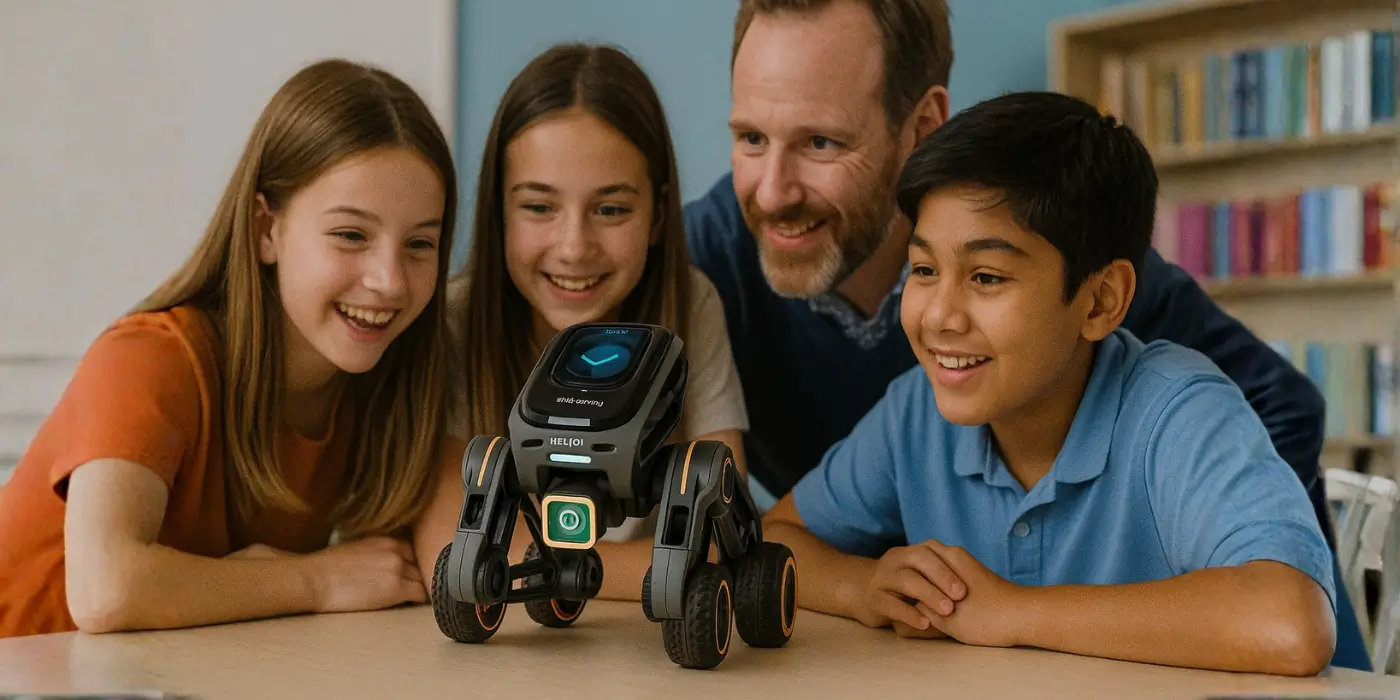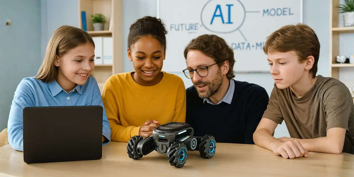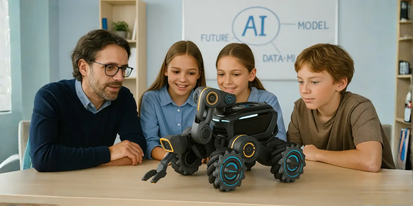 It allows students to program robots using block-based coding or Python while exploring conversational AI and computer vision. Its modular approach fosters logical thinking, creativity, and problem-solving skills.