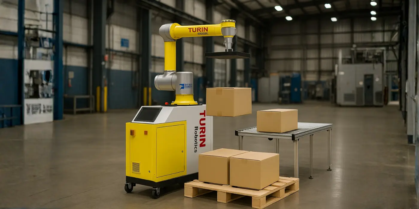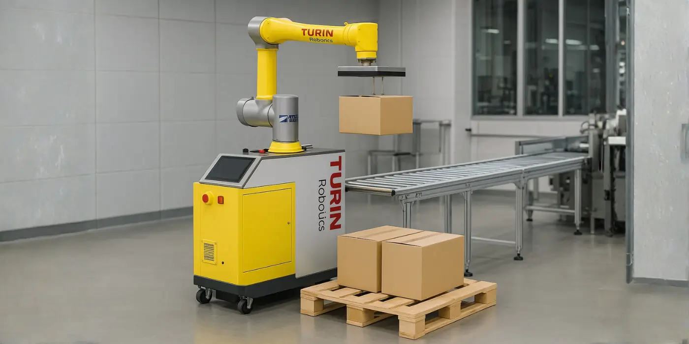 Estación compacta de paletizado con robot y ventosa que organiza cajas de distintos tamaños. Aumenta productividad, elimina sobreesfuerzo humano y se programa en solo cuatro pasos para un rápido ROI
