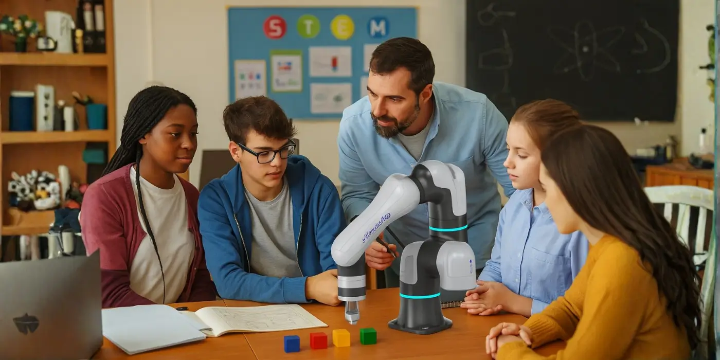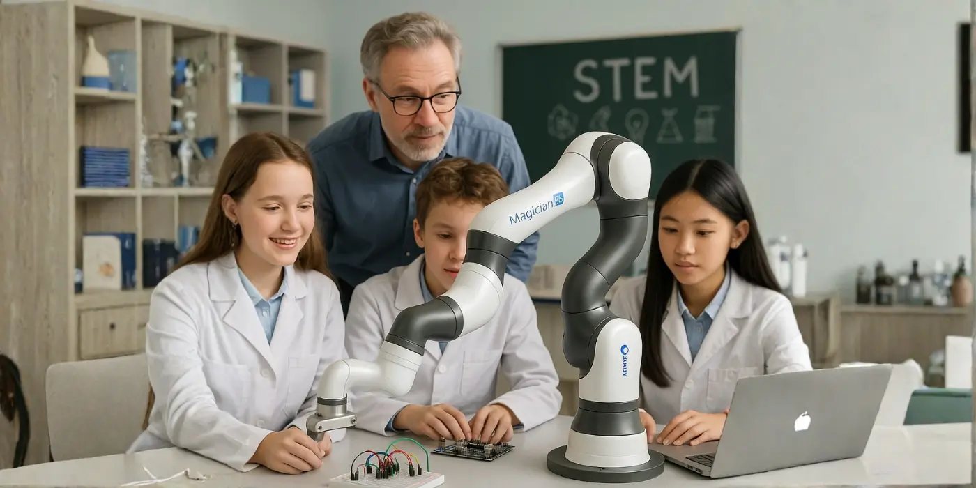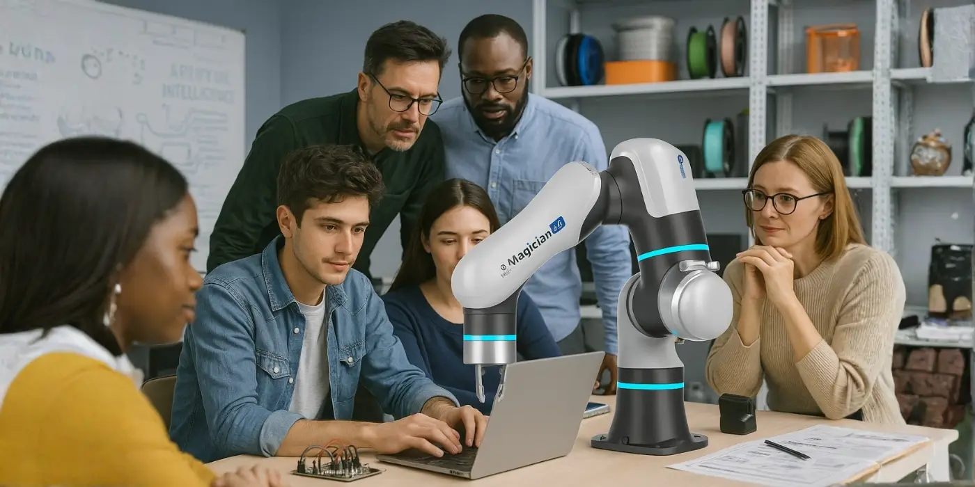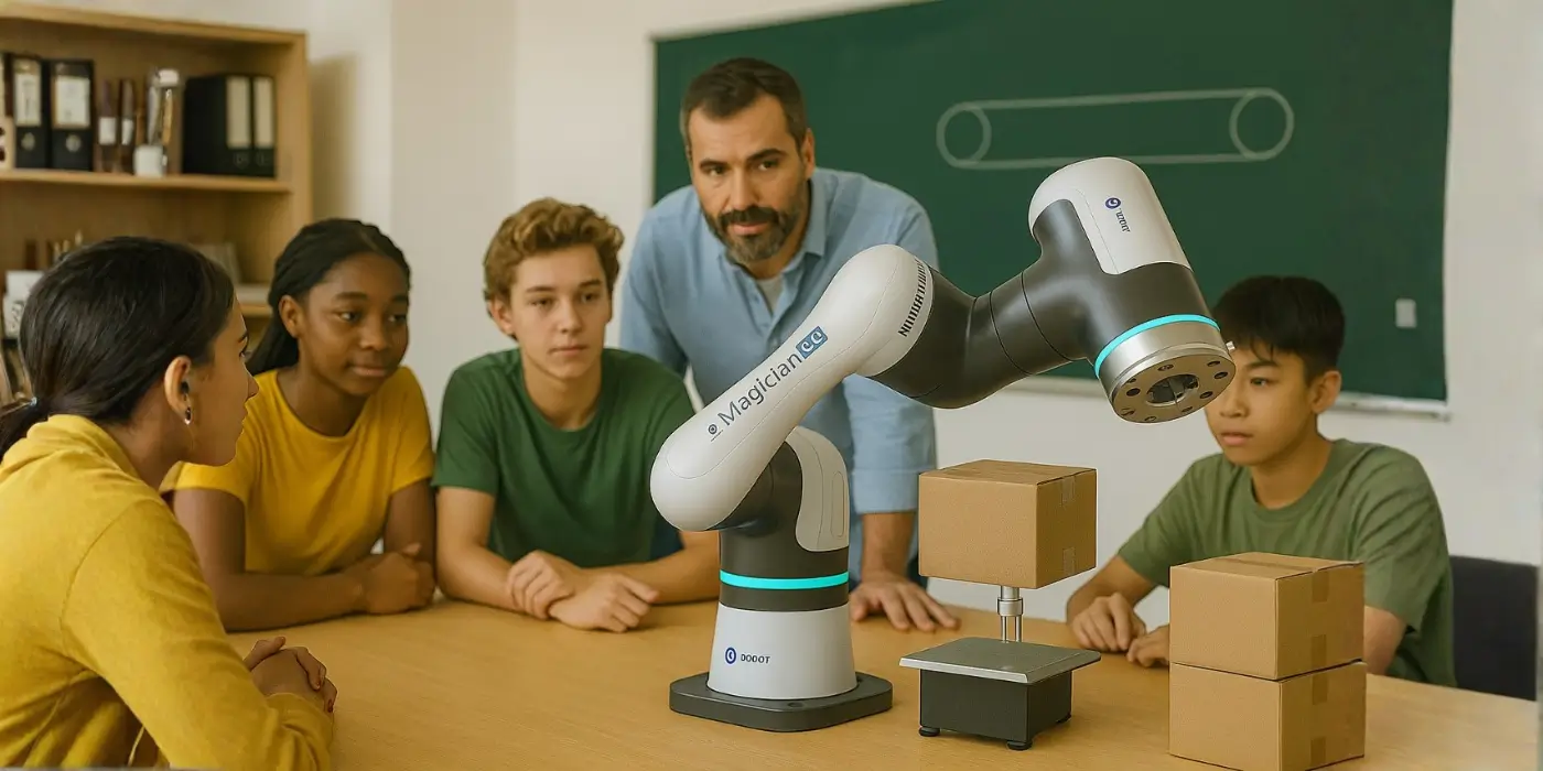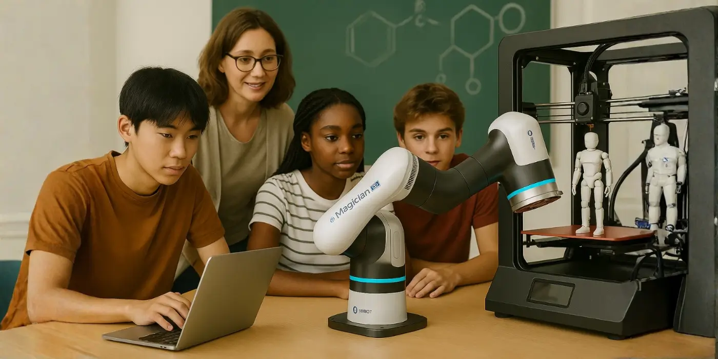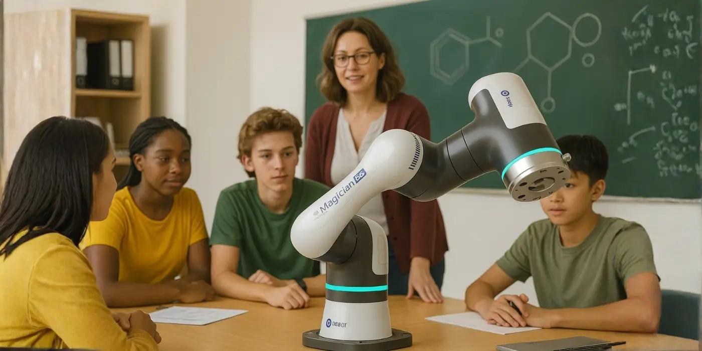Brazo robótico de escritorio 4-DOF para educación superior que imprime en 3D, graba láser, escribe y dibuja. Sus 13 puertos y kits modulares facilitan proyectos de control, programación y automatización académica.